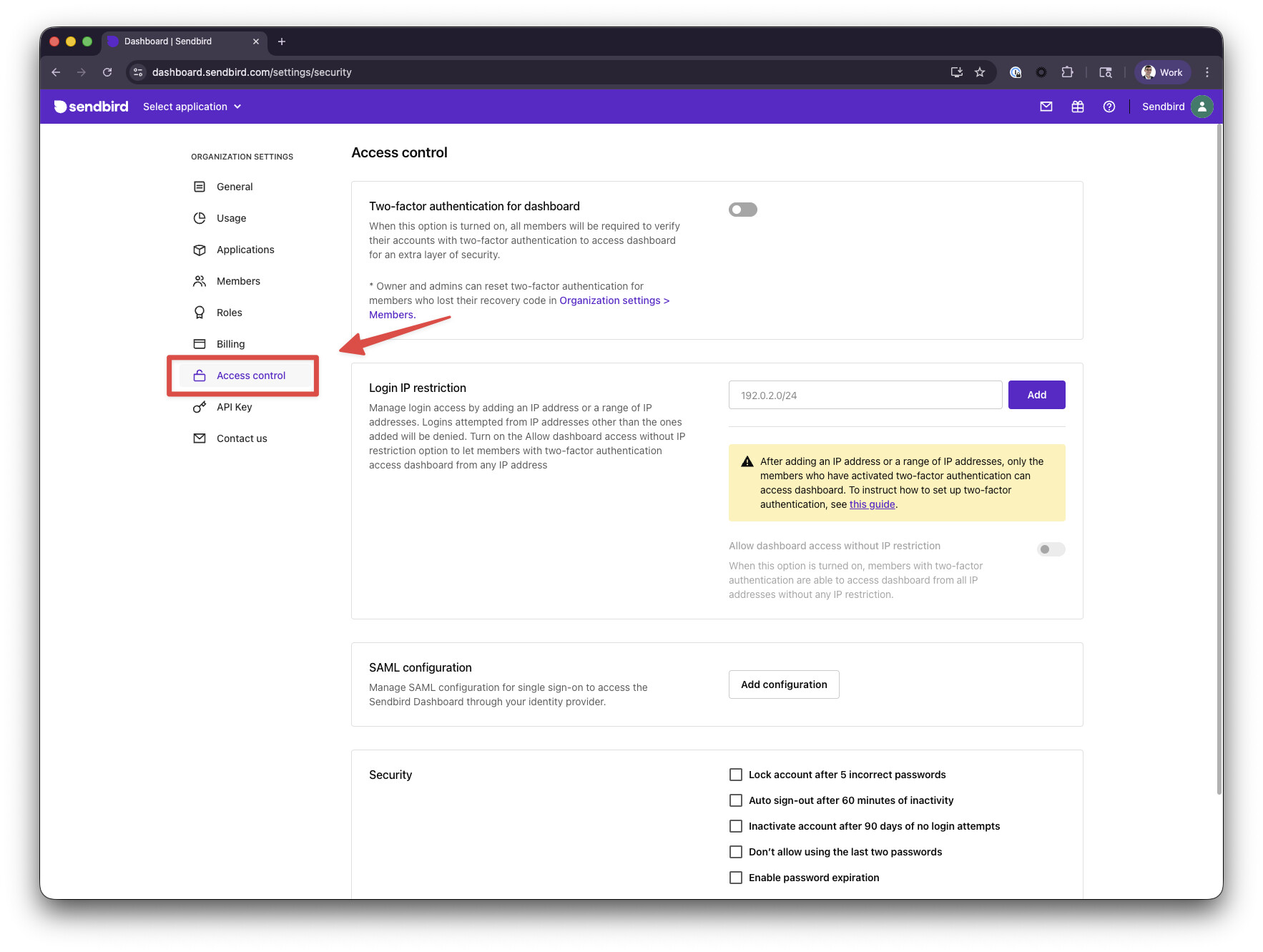- Click on Access Control on the left-hand side of the Dashboard under Organization settings.